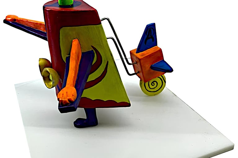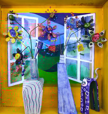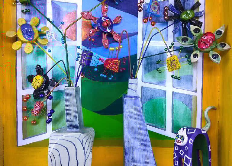 Still Life with Two Ceramic Vases and a Cat (Ceramic, Acrylic on Wood, Wires)